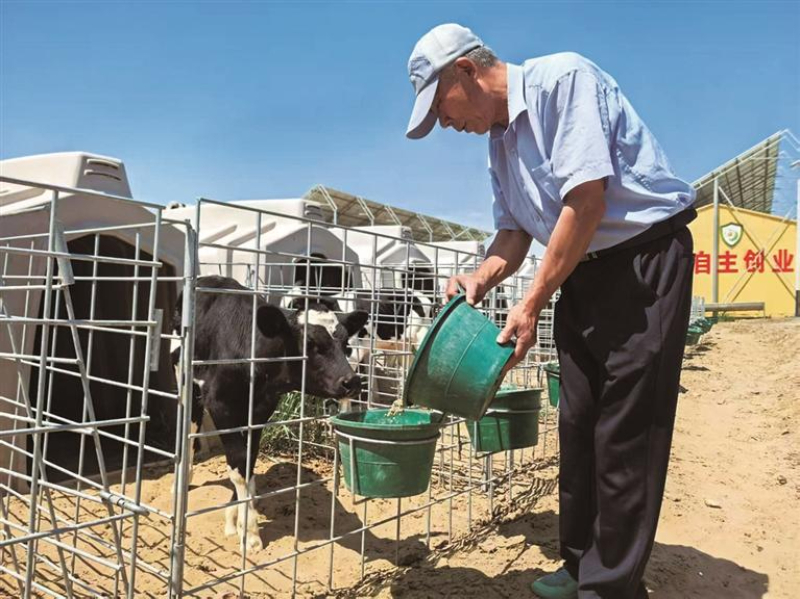 在“蒲公英e家”就业创业基地,工人正在给小牛犊添加饲料。