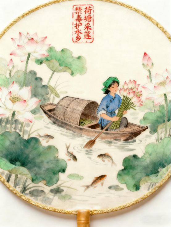 创作过程中,从端午包粽的艾草绿、菱荡采菱的湖蓝,到南湖捕鱼的木色、蚕乡采桑的翠绿,画家们将采菱人弯腰的姿态、渔船渔网的编织纹理等农民劳作细节融入场景,一把把禁毒+农民画折扇栩栩如生。