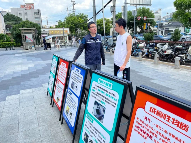 禁毒社工在广场中央摆放新制作的禁毒知识展板,全新的内容吸引大家驻足观看,同时设立禁毒知识咨询点,为过往市民答疑解惑。