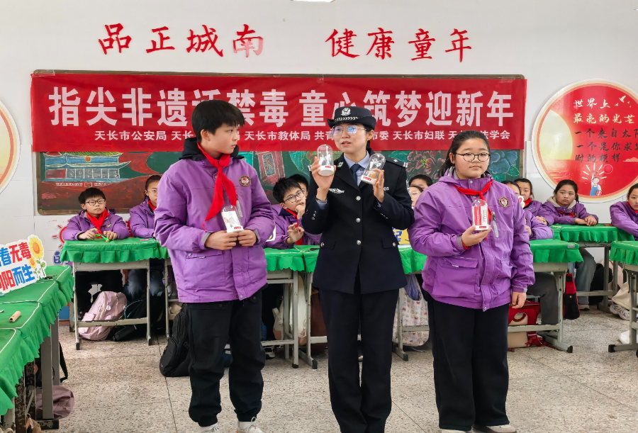 中国禁毒网讯 近日,安徽滁州天长市公安局联合多部门,特邀民间非遗剪纸艺人走进城南小学六年级课堂,以“指尖非遗话禁毒 童心筑梦迎新年”为主题开展了一场别开生面的禁毒宣传活动。
