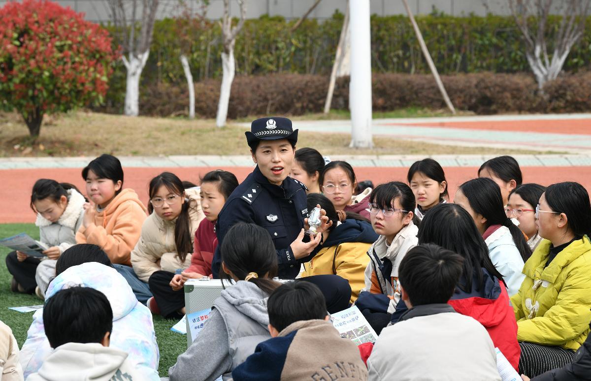 3月20日,安徽省阜南县公安局禁毒大队民警利用第三小学课间休息时间为学生们宣讲禁毒知识。(通讯员 吕乃明 摄)
