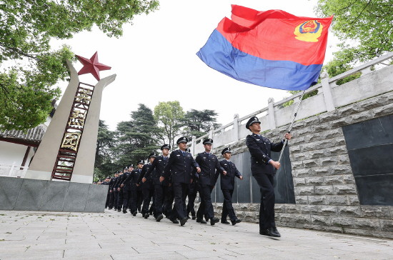 4月2日,清明节前夕,湖北省襄阳市公安局组织局直单位及城区分局110名民警来到市革命烈士陵园,开展清明节公安英烈纪念活动。图为民警在警旗指引下进入英烈园祭扫。记者 刘欢 通讯员 司世伟 摄